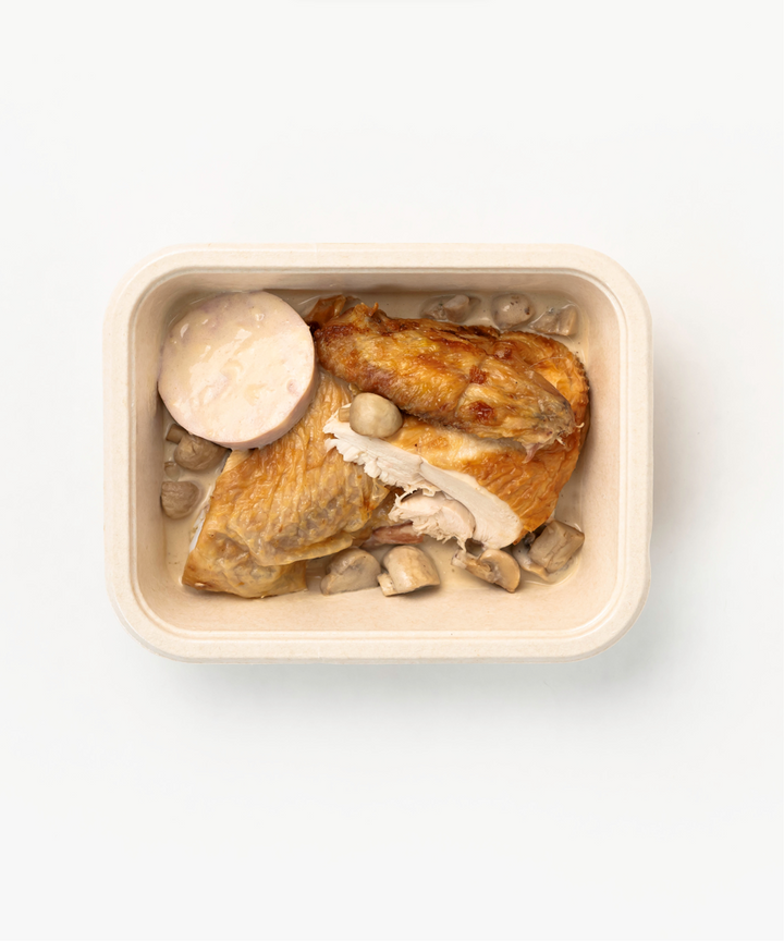 Retrouvez le traditionnel chapon rôti avec sa farce fine et accompagné d'une sauce crème de champignons.
