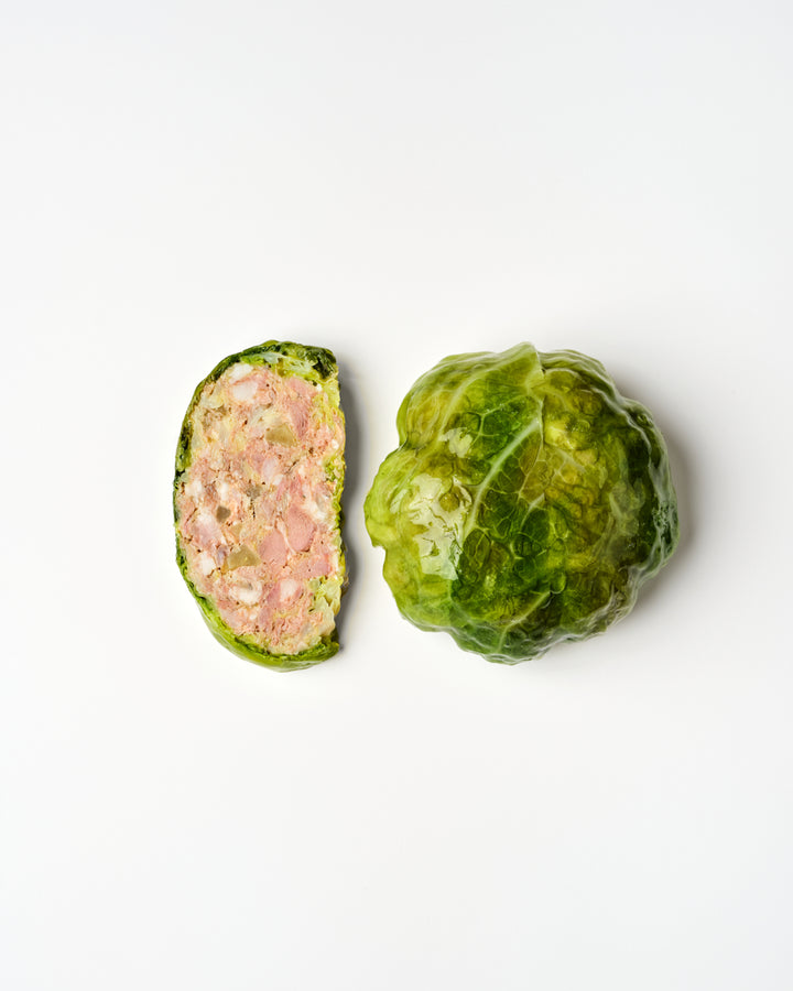 Chou vert, farce de cochon, foie gras de canard, pommes, filet de canard