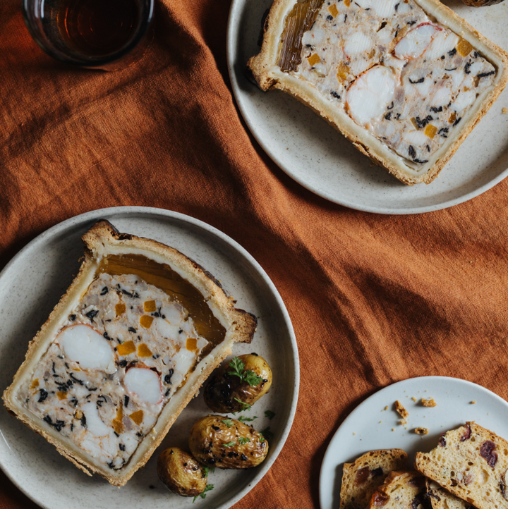 Cette année dans notre pâté en croûte, le homard règne en maître, sublimé par une farce de cochon et la subtilité des trompettes de la mort alliée à la douceur du butternut.