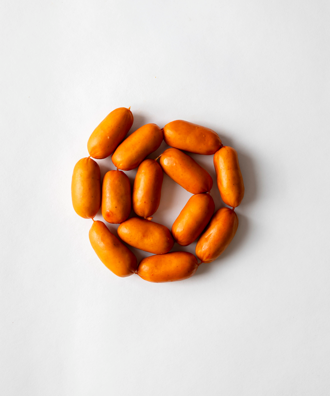 Saucisse cocktail : maigre et gras de porc, eau, pulpe d'ail, (ail, sel, acidifiant E330, conservateur : metabisulfite), conservateur : E250, dextrose, épices, plante arômatique, stabilisant E451i, sel, exhausteur de goût E621, arômes et arômes de fumée, colorant E160b, boyau de porc naturel
