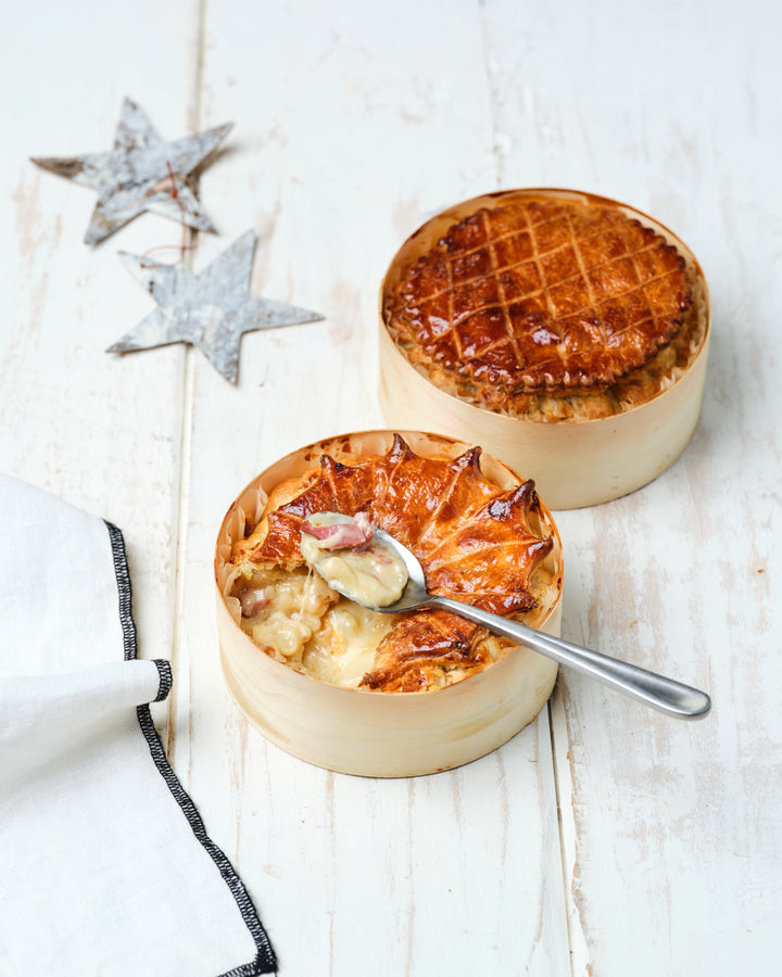 Pâte feuilletée (gluten, lait, œuf), reblochon, pommes de terre, oignons, lardons